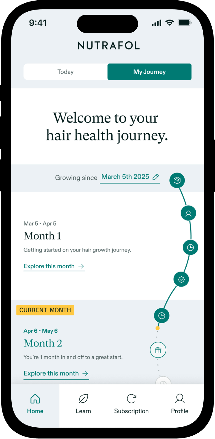 The myNutrafol app is available for both iOS and Android devices. Requires iOS 14 or later, or Android 11 or later. By downloading this app, you agree to our Privacy Policy and Terms of Use.